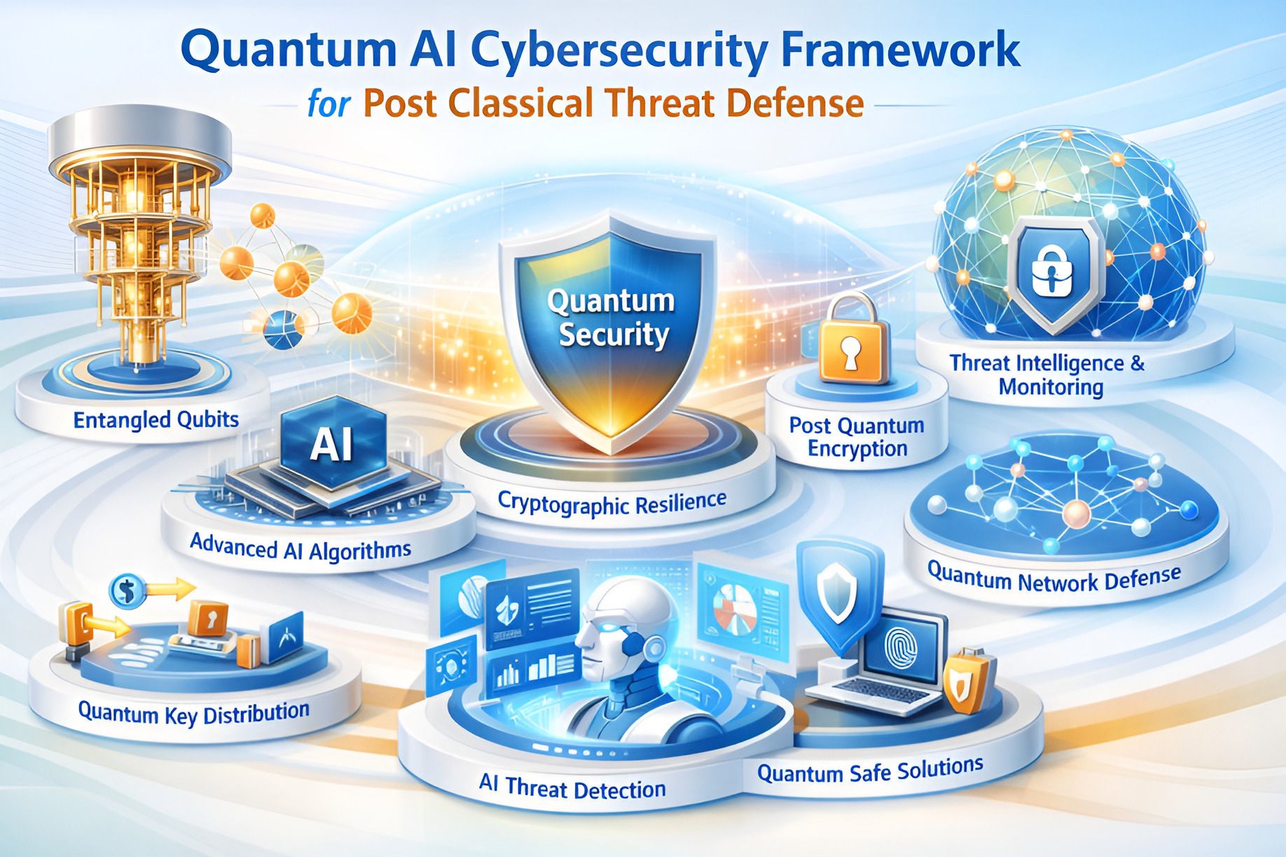 The Quantum AI Cybersecurity Framework is composed of seven tightly integrated segments. Each segment addresses a distinct dimension of post-classical risk while reinforcing the others. Together, they form a resilient system that balances speed, intelligence, and control.